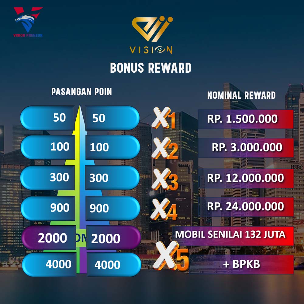 Perhitungan bonus Reward ini berdasarkan pertumbuhan omzet dikaki kecil. Nilai berdasarkan jumlah POIN.