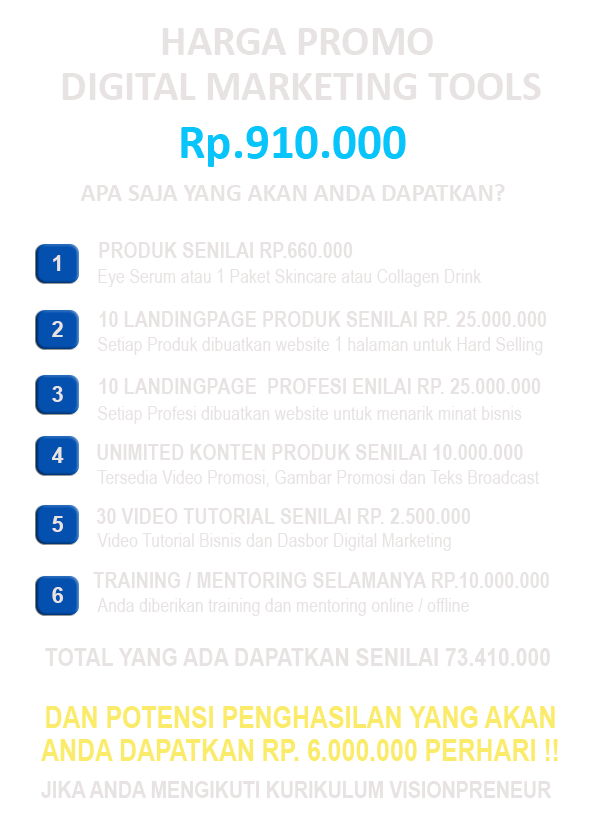 Saat ini Visionpreneur memiliki tools digital berupa platform Web support yang dilengkapi Marketing Tools seperti; StarterKit, Tutorial, Landingpage profesi, landingpage Produk, Gudang Konten (teks broadcast, Gambar Prduk,Video), training online, Kurikiulum Bisnis, dan sistem monitoring & Follow Up.